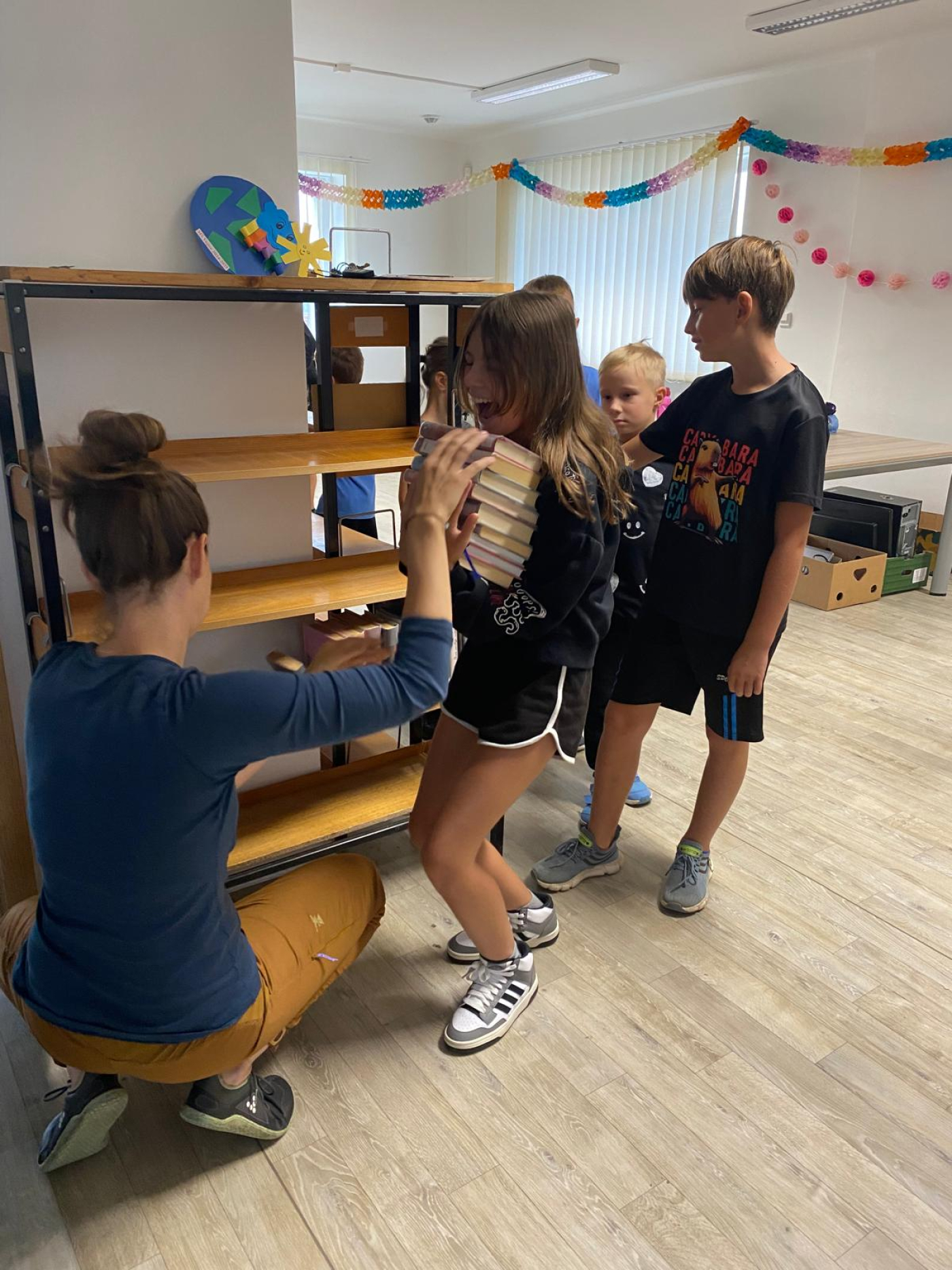 Brigáda se pak změnila v jakýsi čtenářský kroužek. Venku se rozpršelo, a tak děti začaly listovat knížkami, které je během stěhování zaujaly. Prý si je do knihovny možná přijdou vypůjčit.