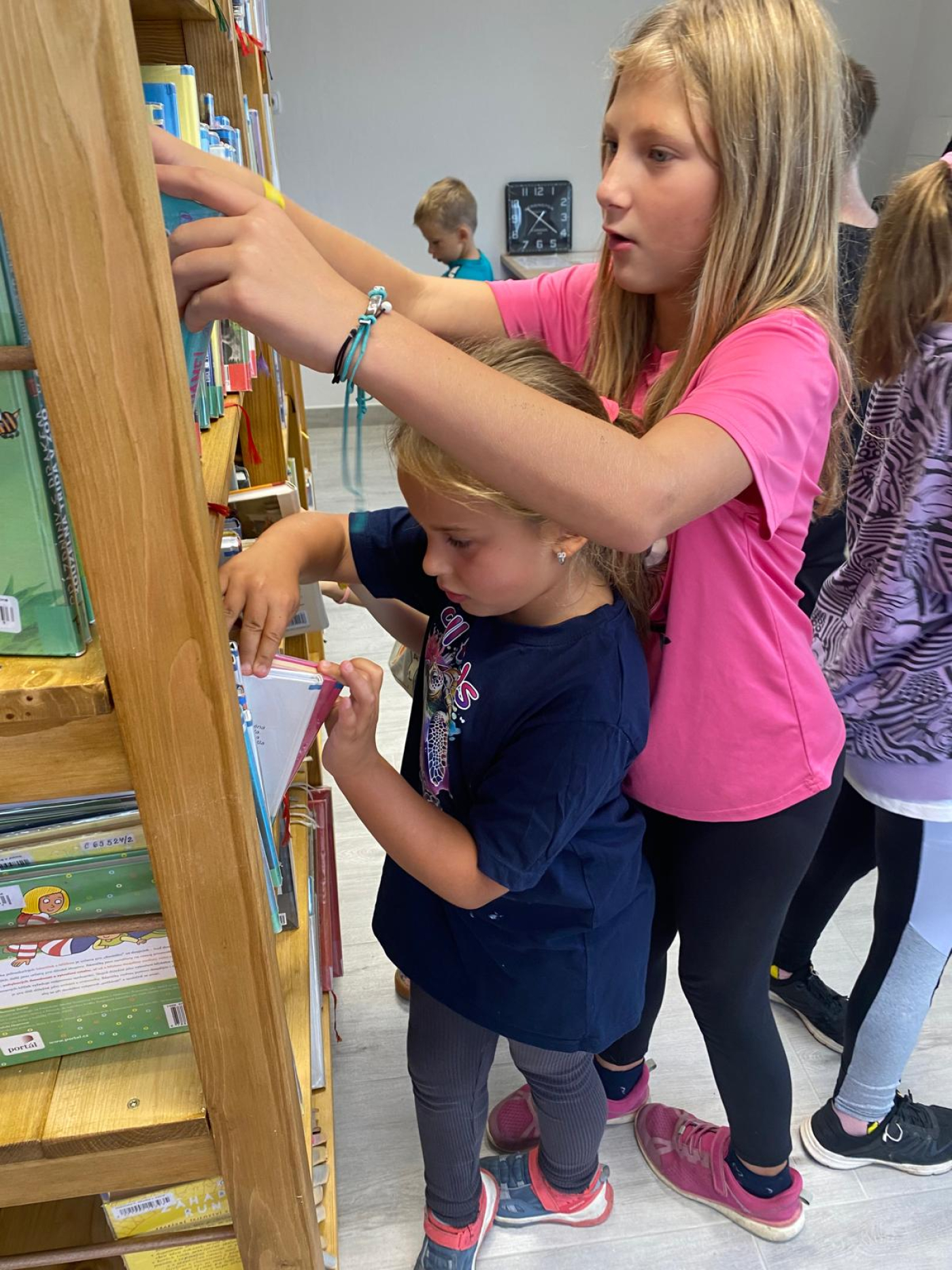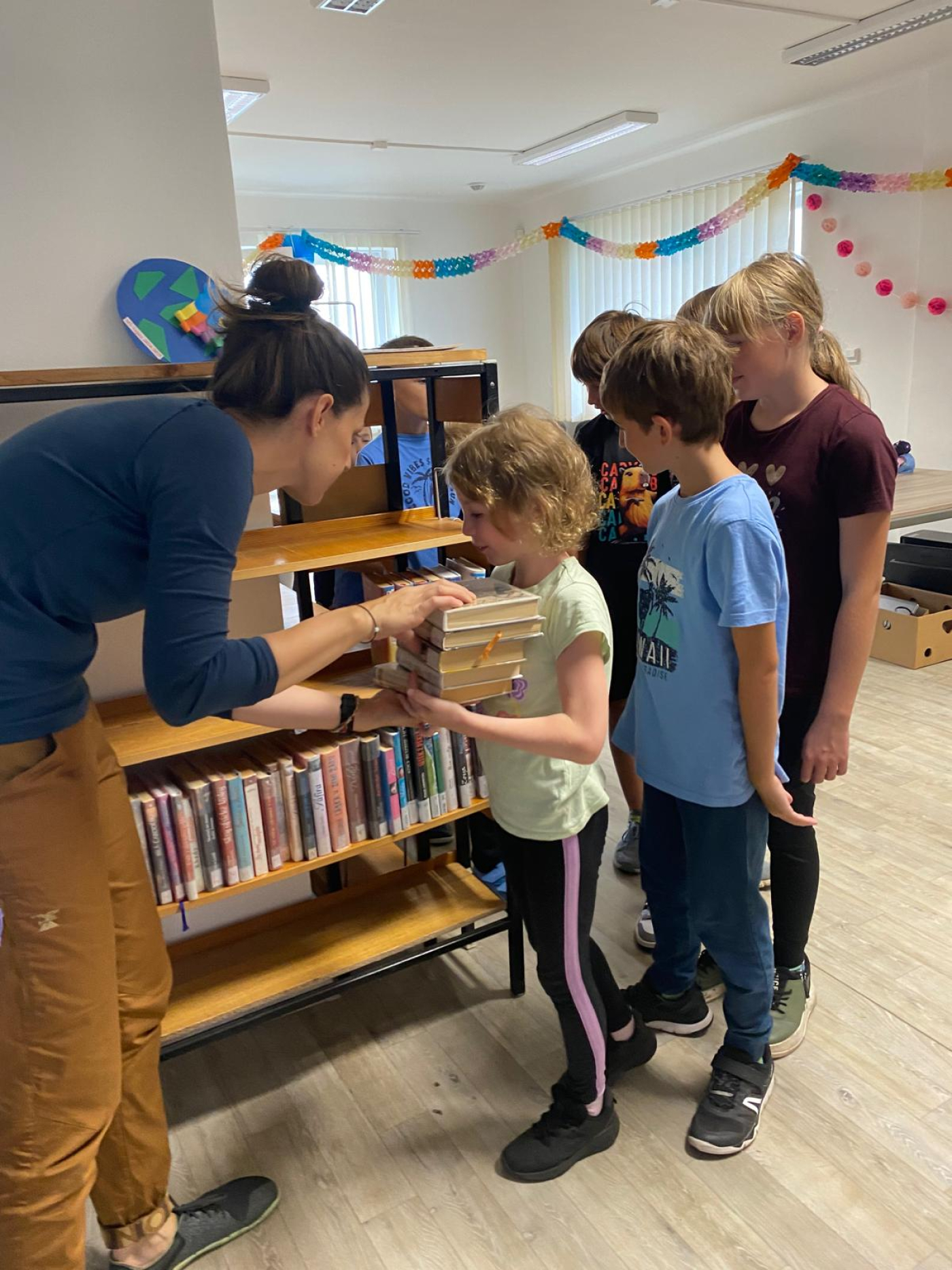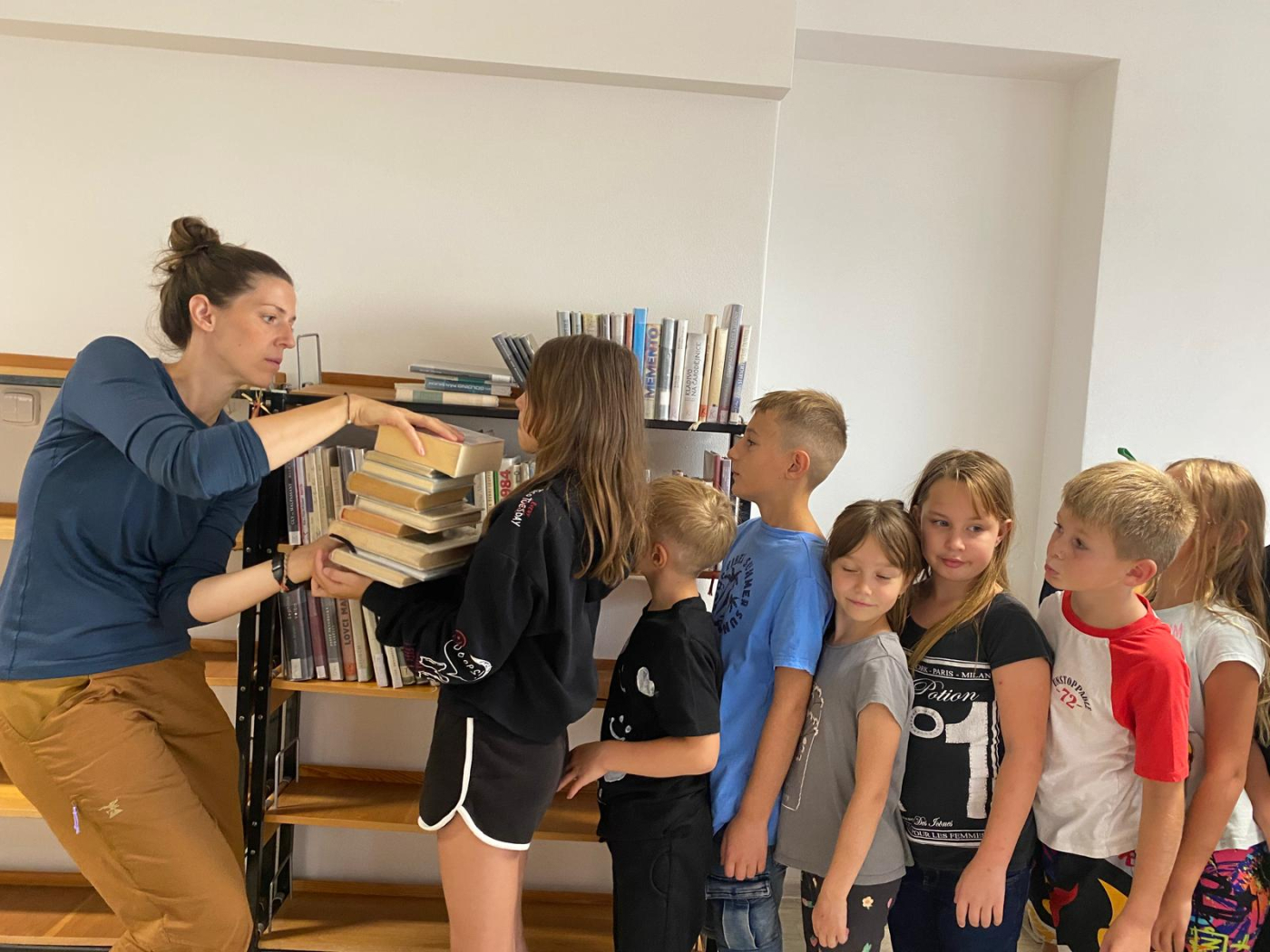 Děti od začátku nasadily takové tempo, že si paní knihovnice Jindra Novotná musela několikrát vyžádat krátkou přestávku, aby knihy správně narovnala do nových regálů.