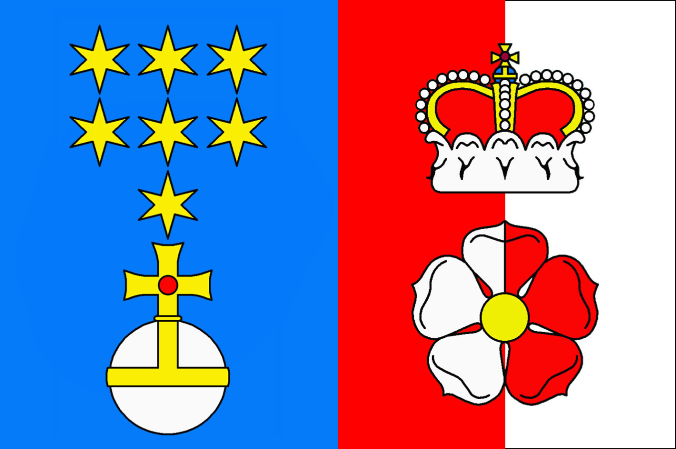 List tvoří modrý žerďový pruh, v němž je sedm (3, 3, 1) žlutých šesticípých hvězd nad bílým, žlutě přepásaným říšským jablkem, vrcholícím žlutým křížem. Ve vlající červeno-bíle polceném pruhu polcená růže opačných barev se žlutým semeníkem, pod knížecí korunou.